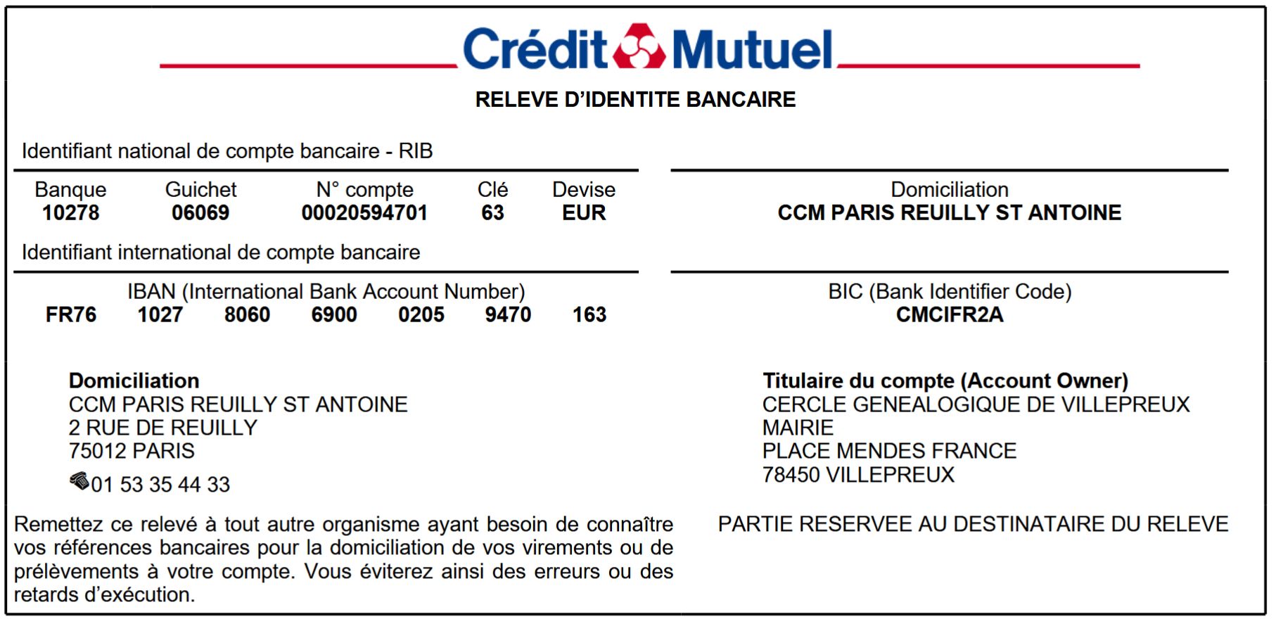 Afin de participer pour votre plus grand plaisir à nos activités, merci d'envoyer un chèque à l'ordre de: CEGEVI accompagné de votre bulletin d'adhésion ou de renouvellement à : CEGEVI, Hôtel de ville - BP CEGEVI, 78450 VILLEPREUX ou si vous souhaitez nous faire parvenir le montant de votre adhésion par virement, informations RIB ci-dessous en bas de page